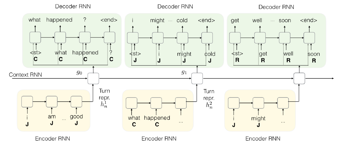 Hierarchical Recurrent Encoder-Decoder[Serban et al., 2016b]通过一个每回合更新自己隐藏层,且基于encoder-decoder RNNs的high level,context RNN捕捉上下文线索。但是没有包含任何人格信息。更多细节参考[Serban et al., 2015a].